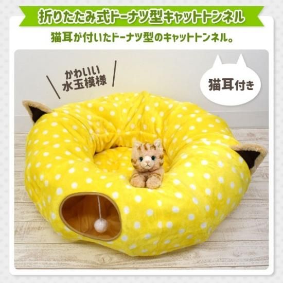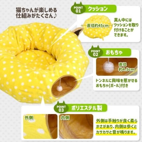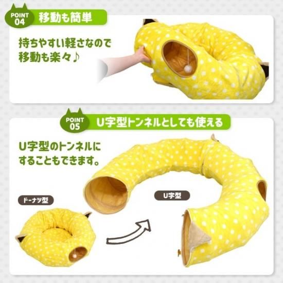 猫耳と黄色い水玉模様が特徴のドーナツ型キャットトンネル。