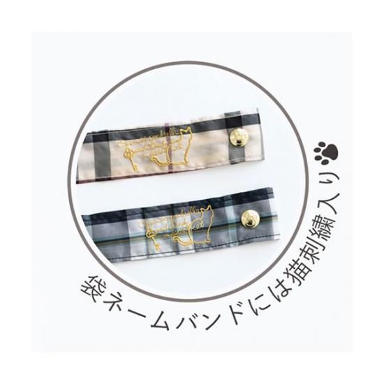 共袋のネームバンドにもおそろいの先染めチェック生地を合わせ、金糸の猫刺繍&猫のあしあとボタンをつけました。シンプルかわいいトラッドテイストの折りたたみ雨傘です。