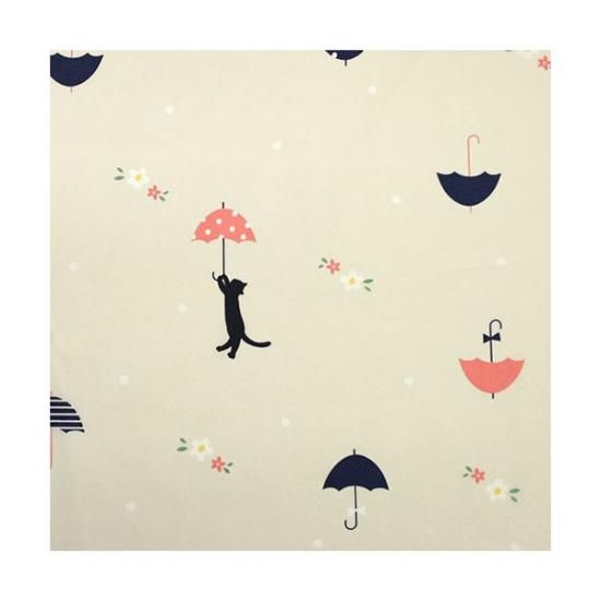 傘に傘の総柄プリントで、ところどころに傘につかまった猫ちゃんがふわりと浮いている、ユニーク&かわいいプリントの折りたたみ雨傘です。